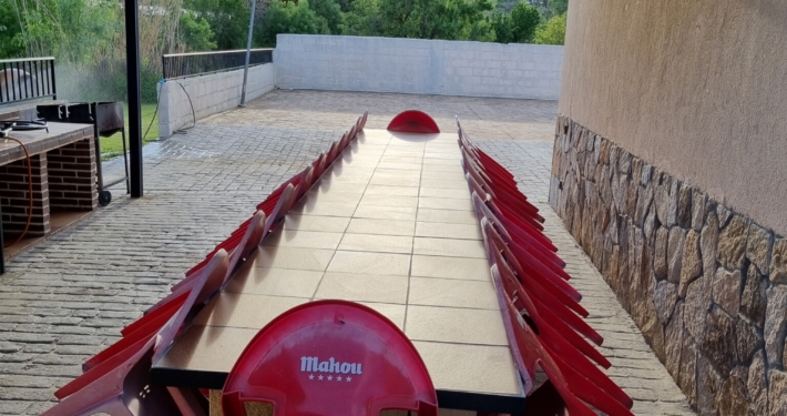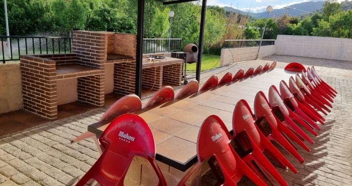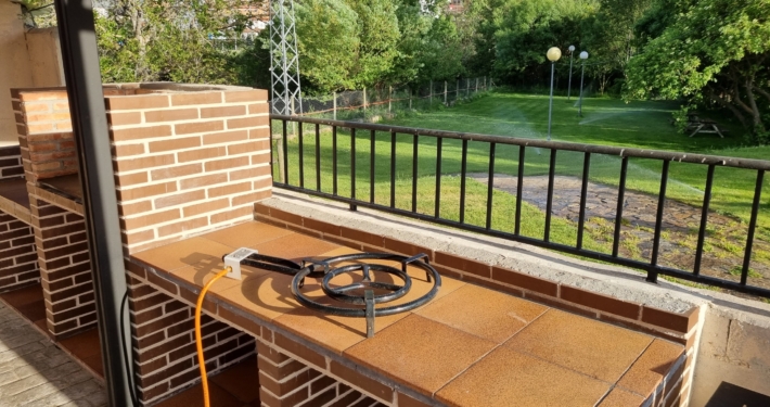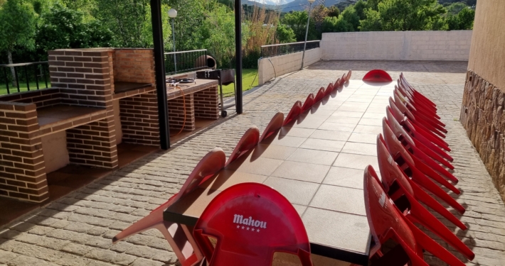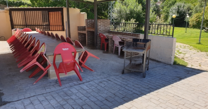 Exterior: Aparcamiento para más de 16 coches, piscina vallada por seguridad para los pequeños, zonas ajardinadas de más de 2.000 m2 iluminadas, barbacoas cubiertas y mesas de exterior.